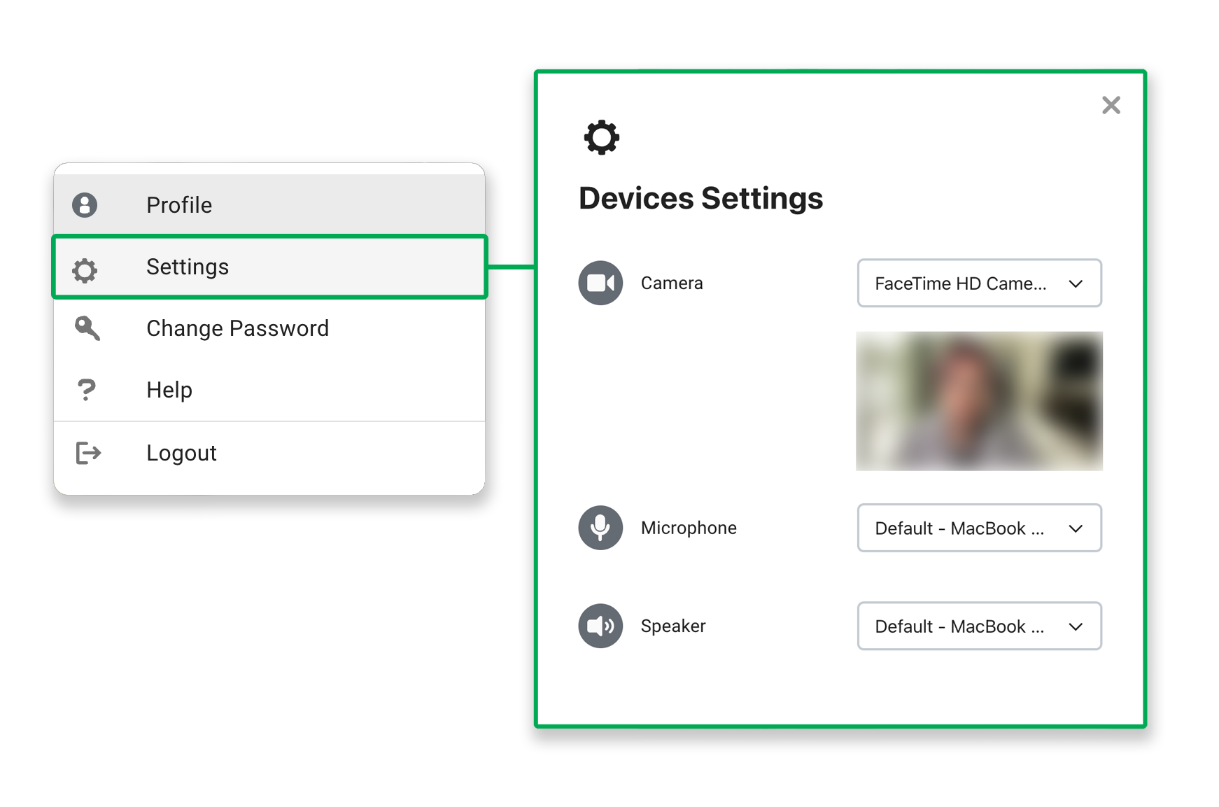 Need to change your camera, speaker, or microphone settings? You can easily adjust them in the Convo Now web app.