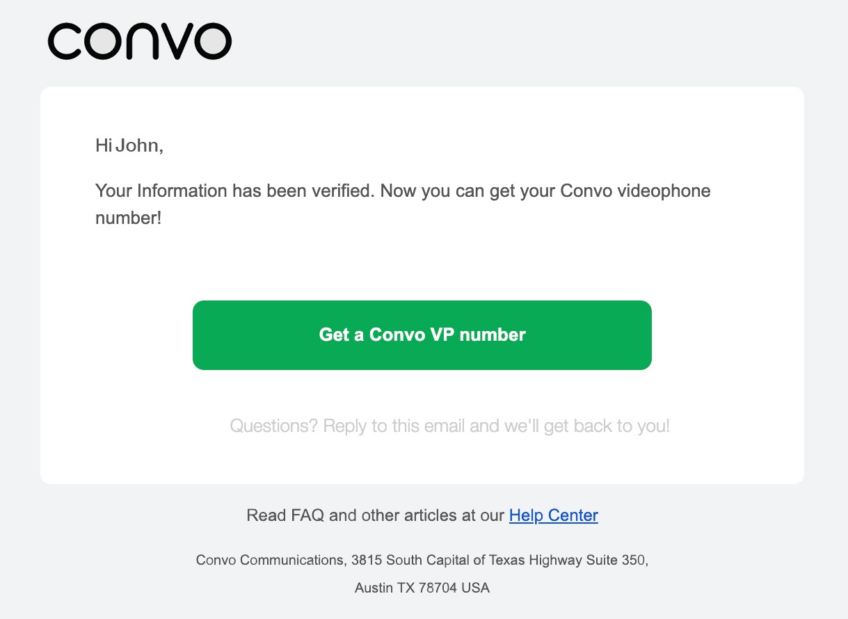 After we verify your information with FCC, you will get an email from us letting you know that your new VP number is ready to be used!